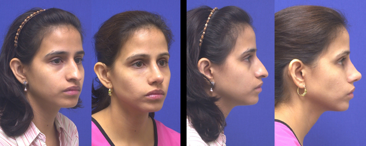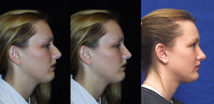 In the lateral view, the hump has been addressed by simultaneously reducing the fullness in the region of the hump and augmenting the depression just above the hump. This creates a pleasing profile that appears natural and balanced with other facial elements.
